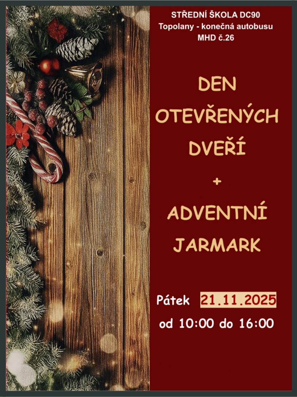 SŠ - DEN OTEVŘENÝCH DVEŘÍ + ADVENTNÍ JARMARK 21.11.2025 10:00 Srdečně Vás zveme na Den otevřených dveří a adventní jarmark! Přijďte nasát sváteční atmosféru a poznat naši školu zblízka! Přijďte se inspirovat, potěšit a podpořit šikovné ruce našich studentů. Těšíme se na Vás!