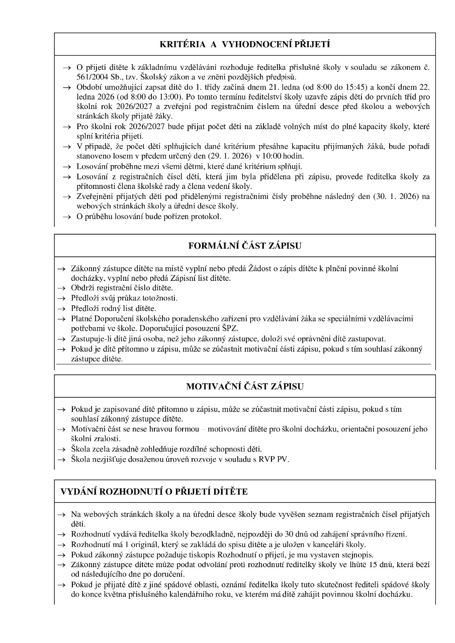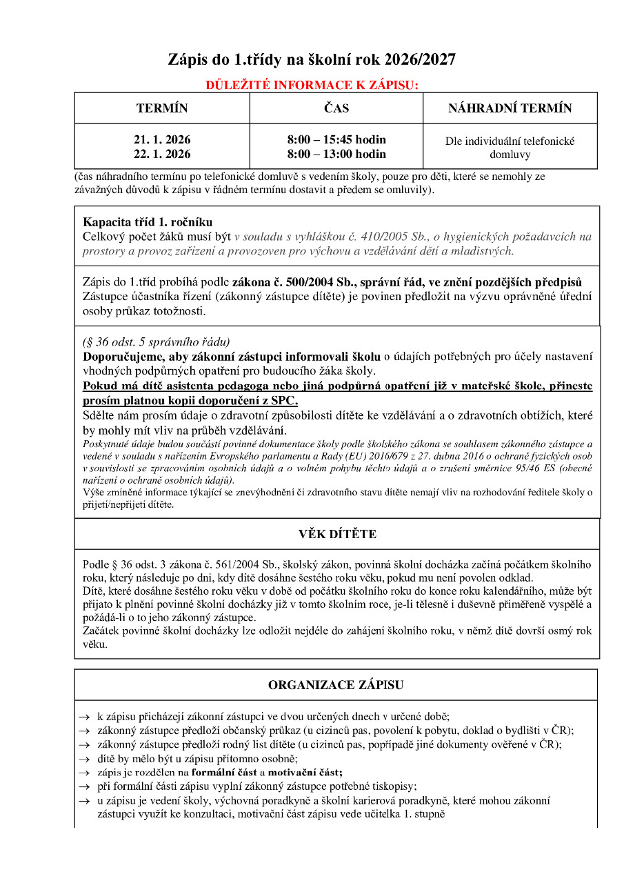 ZŠ - Zápis do 1.třídy na školní rok 2026/2027